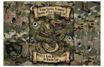 1. Description: The Russell's Viper Rifle Challenge is designed as a performance-based assessment to test a shooter’s proficiency under time pressure and varying conditions. Like the venomous snake it’s named after, the challenge emphasizes a "fast strike" and "precision accuracy." In the tactical training world, an "On Demand" card refers to a skill that you should be able to perform at any moment, without preparation. It is the benchmark of a professional shooter—the ability to produce a perfect result "on demand." This card is offered by Venom Tactical Techniques, Training, & Consulting LLC (VT3C). If you are looking for the exact drills (distances, par times, and target types) printed on the physical card, these are often proprietary to the course. You can typically acquire them by attending a VT3C training session.