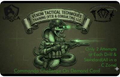 • Description: The Commando Challege on Demand (COD) Card is not for the static shooter. This is an advanced, high-intensity on-demand module designed to test your processing speed, mechanical fluency, and tactical adaptability. We push the "Venom Standard"—aggression balanced with precision. This challenge integrates the "Holy Trinity" of combat arms—Rifle, Shotgun, and Pistol—into a seamless, fluid workflow. You will not just shoot; you will fight through malfunctions, reloads, and complex environments. Warfighting doesn't stop when the sun goes down. This challenge includes a mandatory block on limited-visibility operations. This qualification offered by Venom Tactical Techniques, Training, (VT3), & Consulting LLC. The Commando Card generally serves as a standards-based evaluation or "skills check" for handgun proficiency. The card is designed to provide a "on demand" standard that a shooter should be able to perform limited warm-up and unknown drills, par times, and distances. It validates that the student has mastered the core fundamentals  If you are looking for the exact drills (distances, par times, and target types) printed on the physical card, these are often proprietary to the course. You can typically acquire them by attending a VT3C training session.