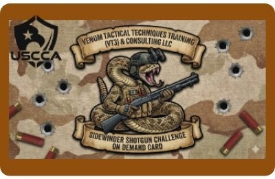 • Description: The Sidewinder Shotgun Challenge on Demand Card is a specific skills-based training evaluation offered by Venom Tactical Techniques, Training, & Consulting LLC (VT3C). VT3C challenge is a distinct curriculum designed to master high-performance shotgun handling. The Sidewinder Shotgun COD Card is designed for shooters who want to push the limits of the shotgun platform, moving beyond basic static range shooting into dynamic, high-stress tactical applications. The card is designed to provide a "on demand" standard that a shooter should be able to perform limited warm-up and unknown drills, par times, and distances. It validates that the student has mastered the core fundamentals  If you are looking for the exact drills (distances, par times, and target types) printed on the physical card, these are often proprietary to the course. You can typically acquire them by attending a VT3C training session.